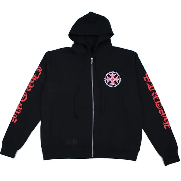 At the core of this hoodie’s visual impact is the iconic Chrome Hearts Clothing cross leather patch, crafted from genuine leather and expertly hand-applied. Each leather patch displays the brand’s signature tooling, texture, and meticulous precision—hallmarks of Chrome Hearts’ artisan-driven approach. Complementing this are embroidered or printed CH logo details placed strategically across the garment, reinforcing the brand’s instantly recognizable aesthetic.